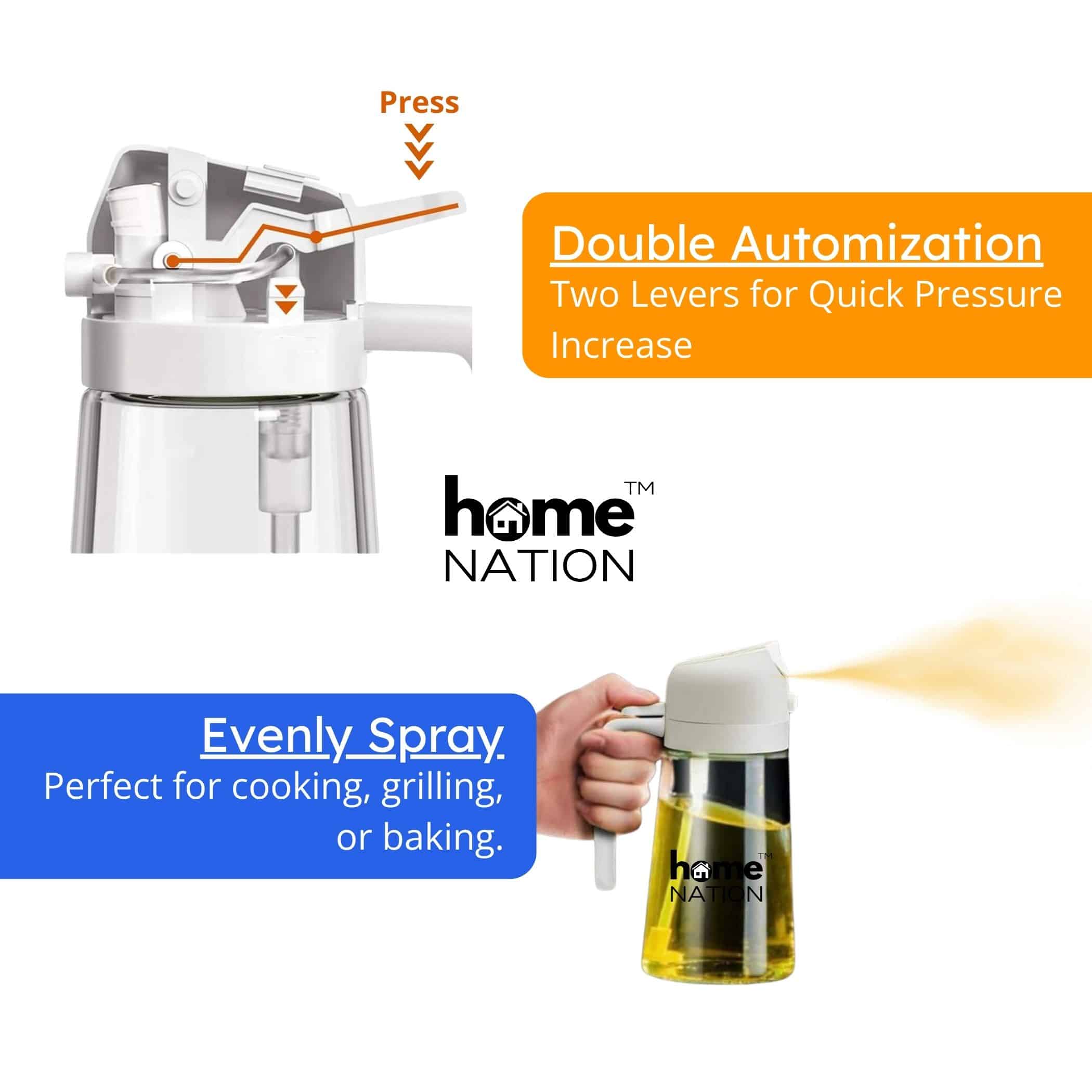 With its advanced sprayer nozzle, you can create an even, fine mist—perfect for coating air fryer baskets, salad dressings, or baking trays. The precise pour spout allows you to drizzle oil evenly on your dishes without waste. It is suitable for all types of cooking oils such as olive oil, vegetable oil, avocado oil, canola oil, vinegar, soy sauce, and more.