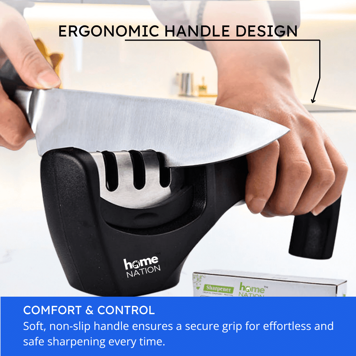 The ergonomic handle gives a comfortable and firm grip while sharpening. The anti slip base keeps the sharpener stable on the kitchen counter. Simply place it on a flat surface, hold the handle, and pull the knife gently through the slots. This kitchen sharpening tool is safe for beginners and easy for daily use. The strong and durable design supports long term use at home.