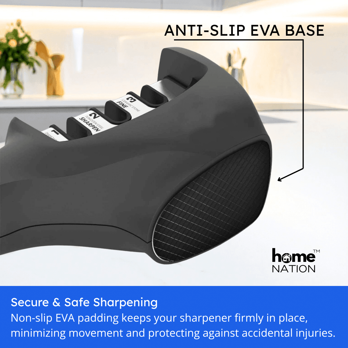 Anti Slip Base for Safety: Non slip bottom keeps the sharpener stable on the counter while sharpening.