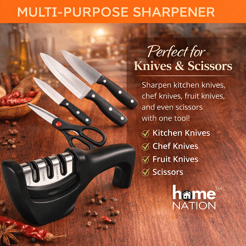 This multipurpose knife and scissor sharpener works for many common kitchen tools. You can sharpen chef knives, vegetable knives, fruit knives, and household scissors using one compact tool. It is a useful kitchen accessory for homes that want a quick and reliable sharpening solution. Instead of using different tools, this blade sharpener handles both knives and scissors with ease.