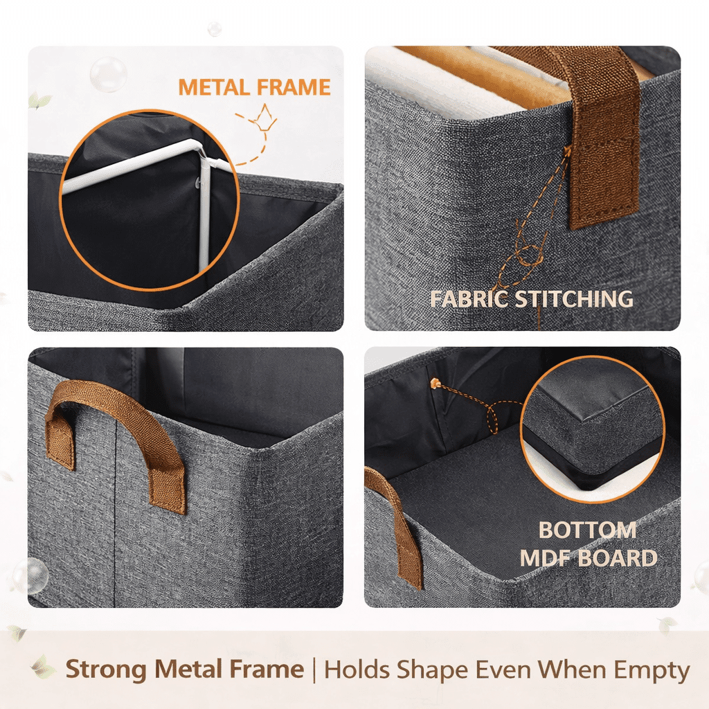 This fabric storage box is made from high-quality polyester and EVA fabric that feels thick, durable, and long-lasting. The reinforced stitching around the edges and handles adds extra strength, making it suitable for daily use. The material is breathable, easy to clean, and designed to maintain a neat look over time.