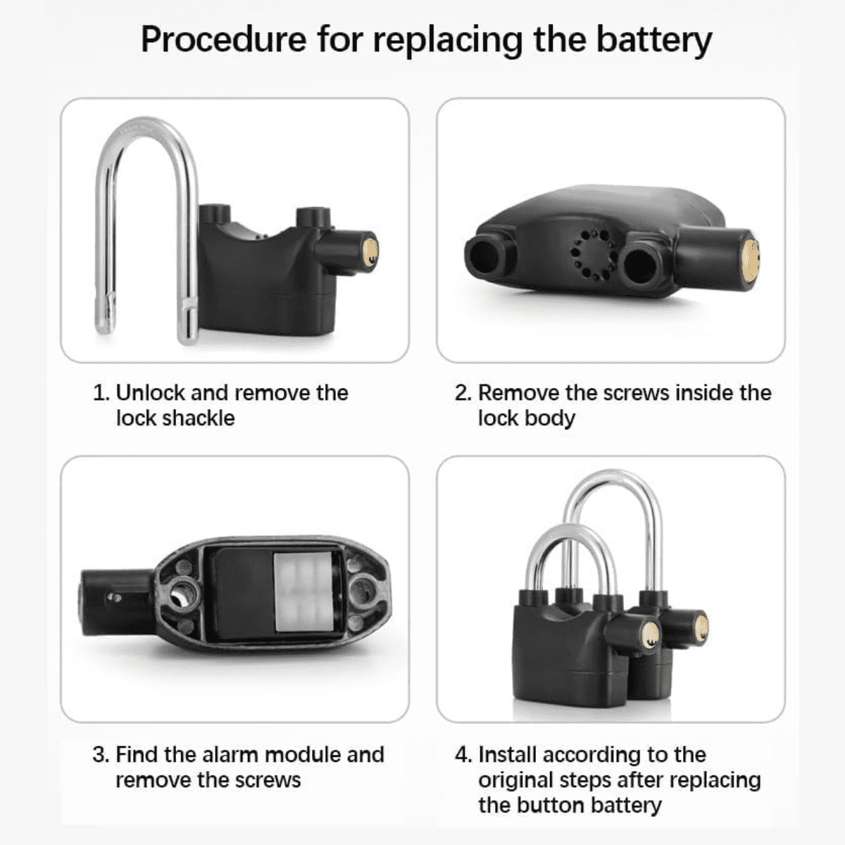 The lock operates on replaceable batteries (included) and features low power consumption for long battery life. It is simple to install and use, just like a regular padlock, but with the added benefit of an intelligent alarm system.