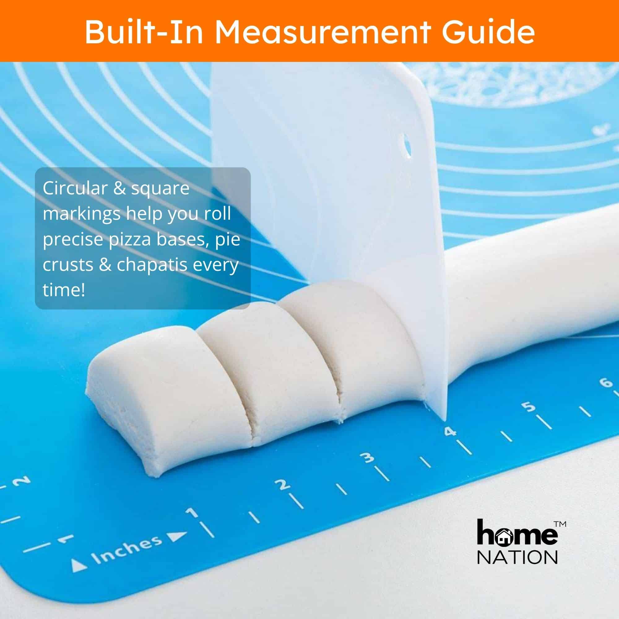 Clear measurement guides are printed on the mat to help you roll dough to the perfect size for pizzas, rotis, pies, or pastries. The anti-slip bottom keeps it stable on your countertop while you work.