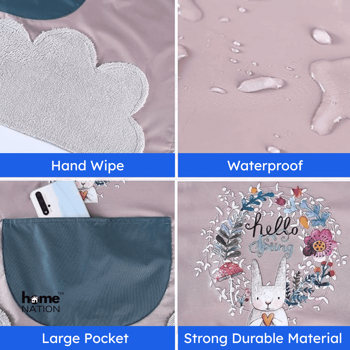 Made from high-quality PVC material, the apron is waterproof, oil-resistant, and easy to wipe clean after every use. The fabric surface is smooth and treated to repel liquids, allowing water droplets and oil splashes to slide off easily. It also features a soft hand towel patch on both sides for quick hand wiping while cooking.